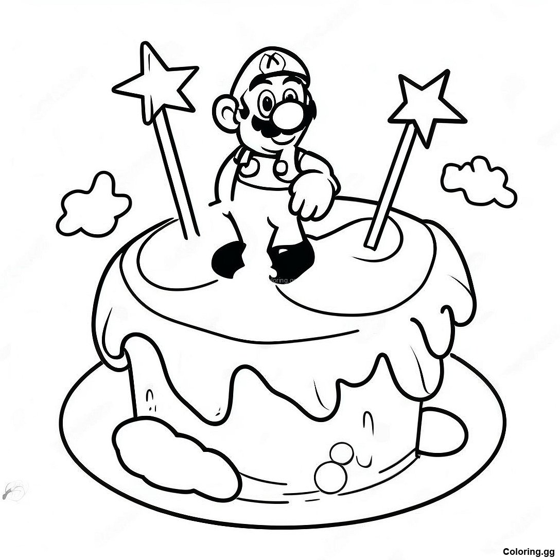 다채로운 마리오 생일 케이크 색칠 공부 페이지의 인쇄 가능한 PDF 다운로드