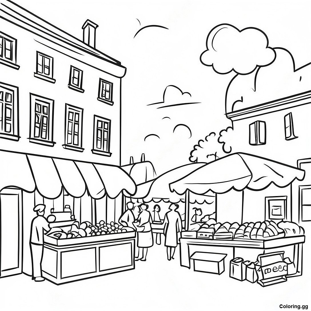 다채로운 프랑스 시장 풍경 색칠 공부의 인쇄 가능한 PDF 다운로드