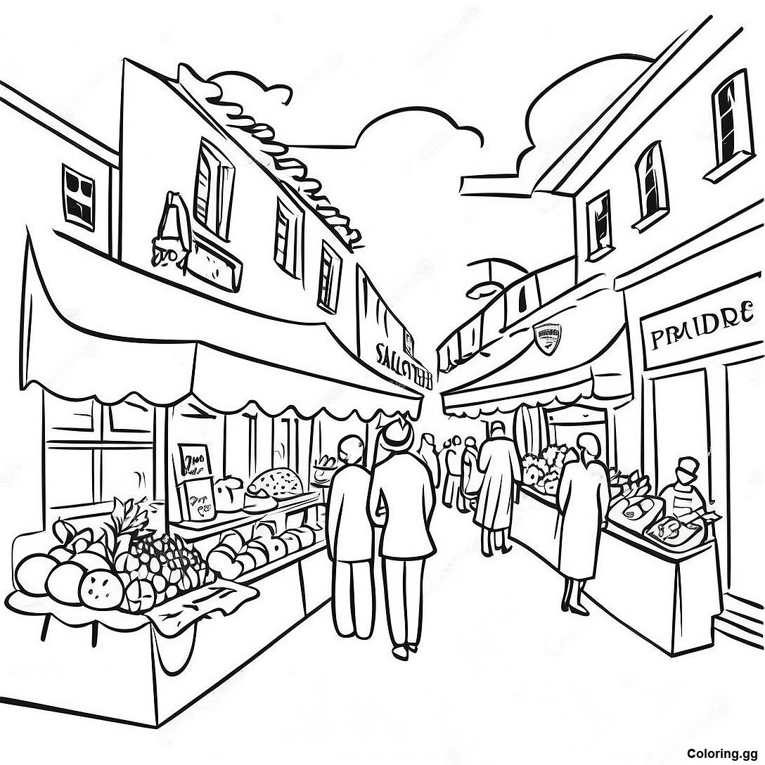 다채로운 프랑스 시장 풍경 색칠 공부의 인쇄 가능한 PDF 다운로드