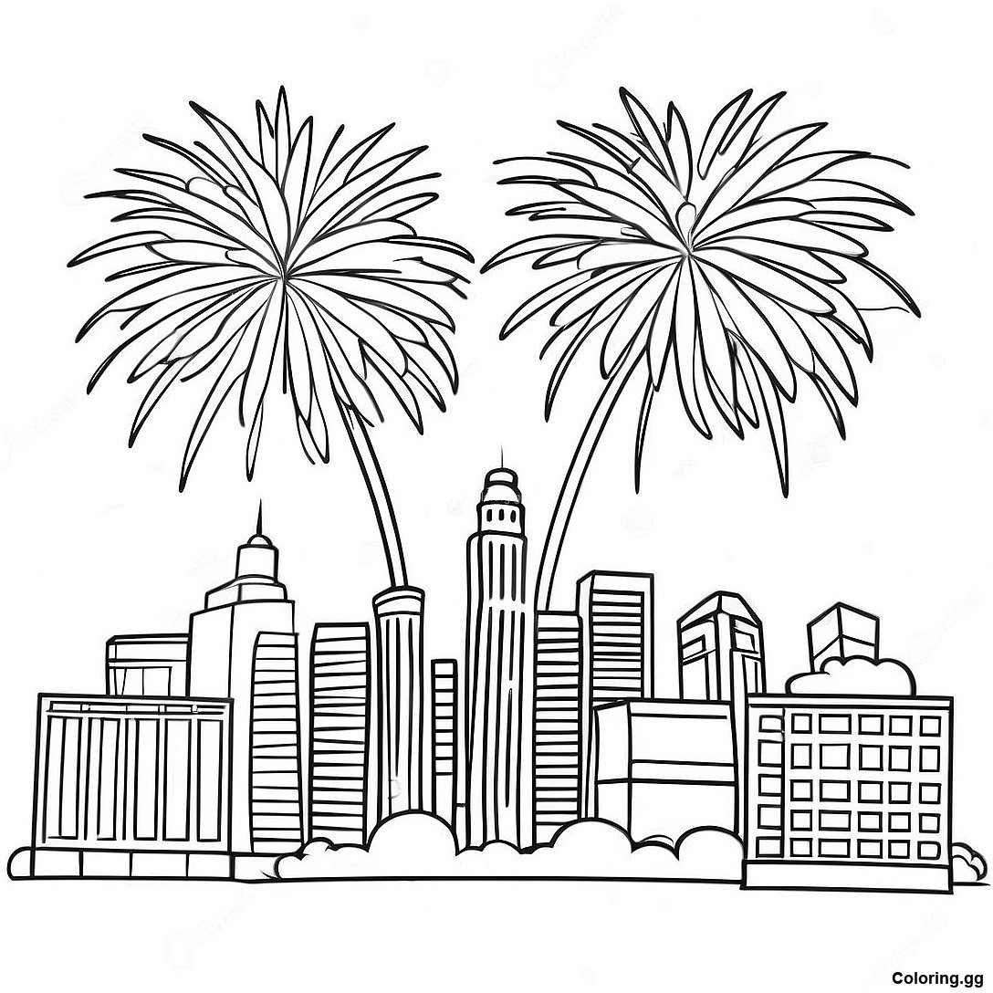 도시 위로 터지는 불꽃놀이 색칠 공부의 인쇄 가능한 PDF 다운로드