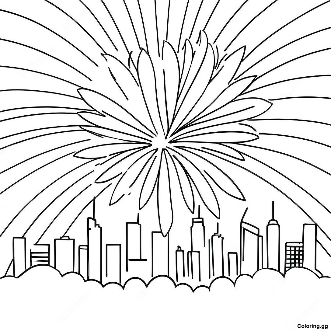도시 위로 터지는 불꽃놀이 색칠 공부의 인쇄 가능한 PDF 다운로드