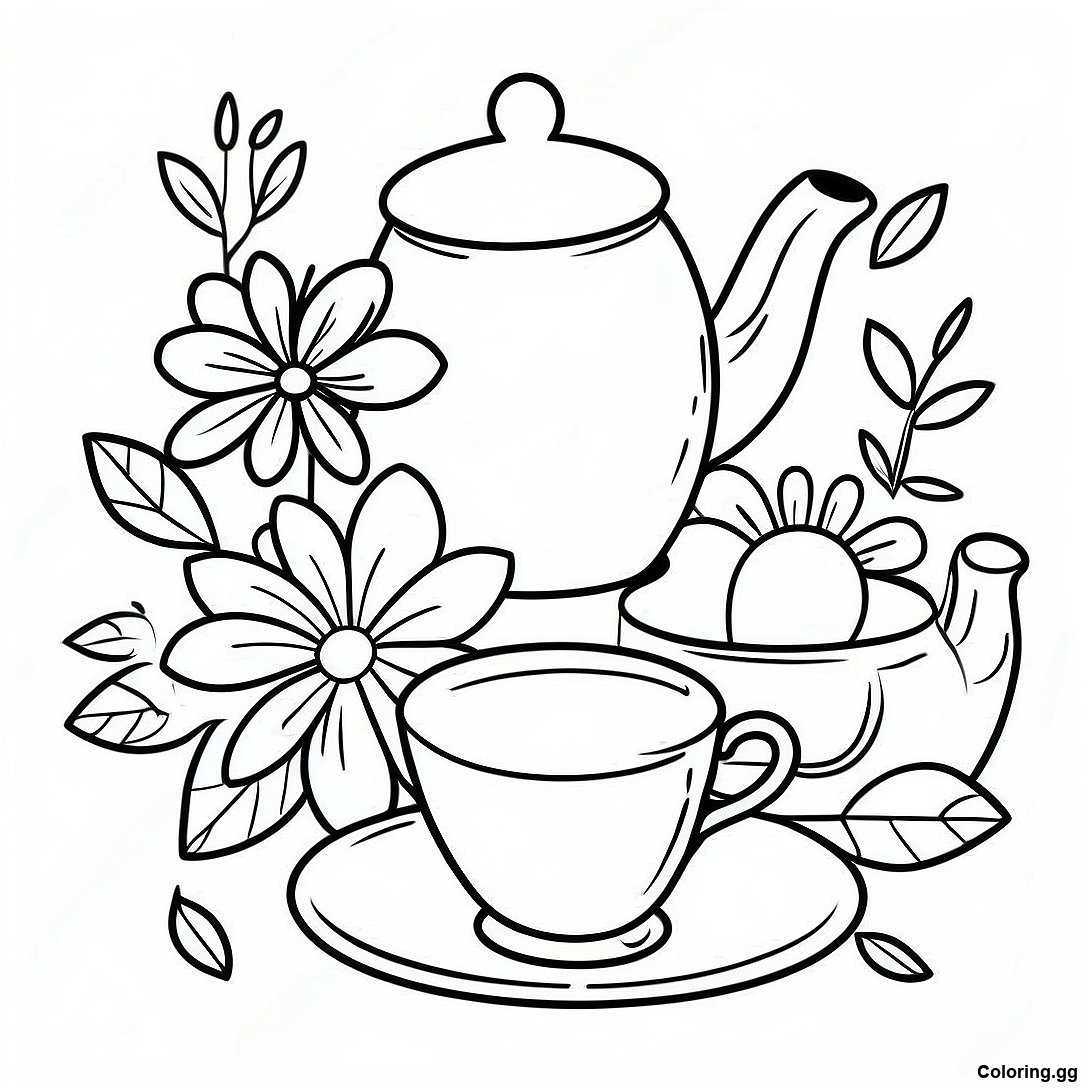 꽃과 함께하는 우아한 티 파티 색칠 공부의 인쇄 가능한 PDF 다운로드