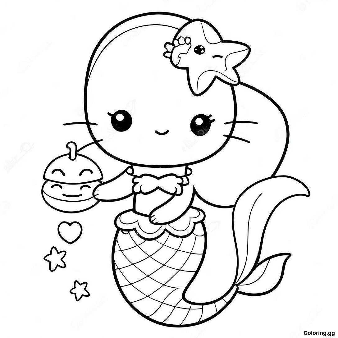 귀여운 헬로키티 인어와 불가사리 색칠 공부의 인쇄 가능한 PDF 다운로드