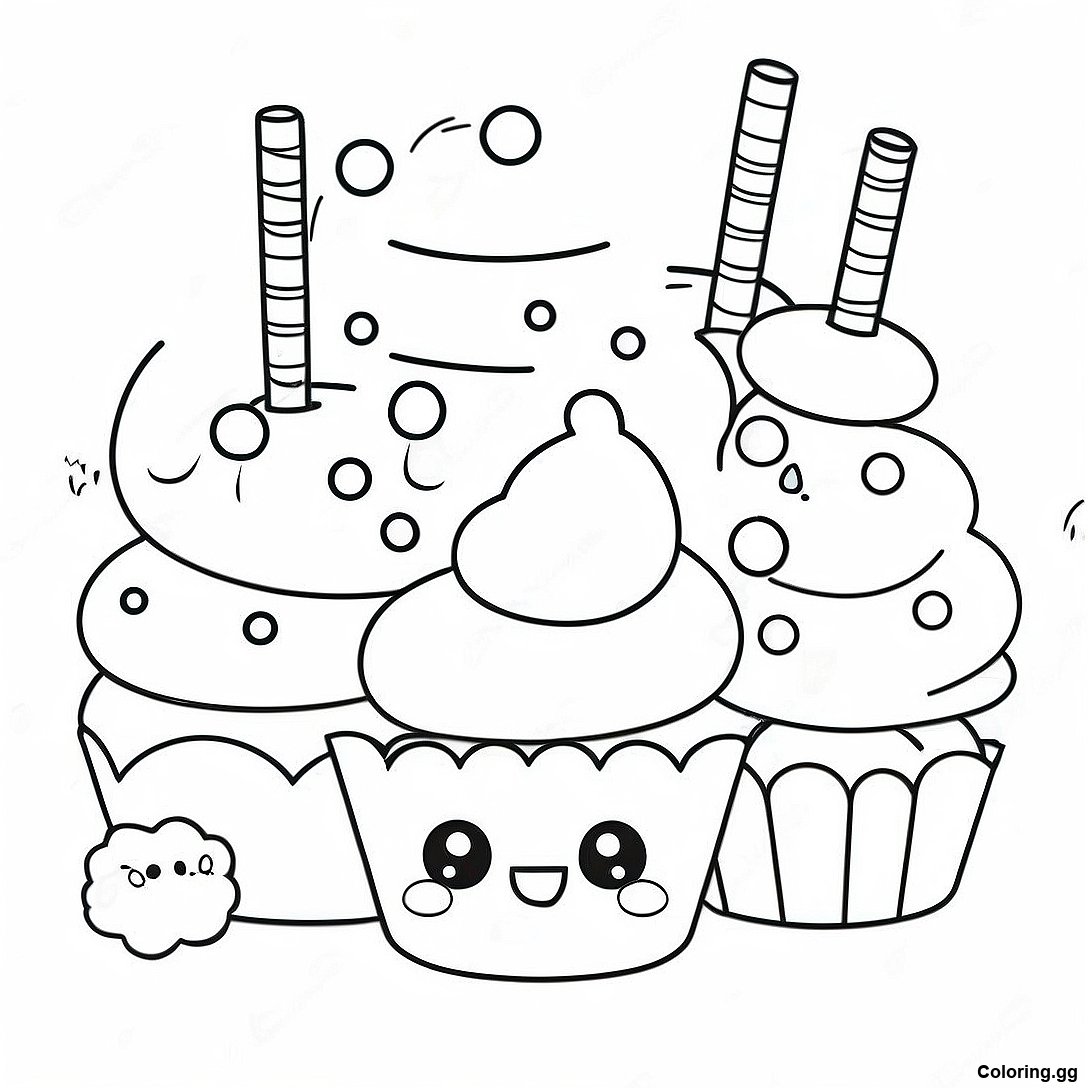 컵케이크와 귀여운 넘놈 색칠 공부 페이지의 인쇄 가능한 PDF 다운로드