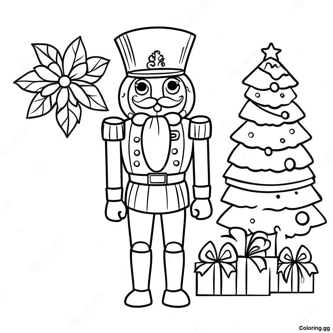크리스마스 트리와 함께 있는 너트크래커 색칠 공부의 인쇄 가능한 PDF 다운로드