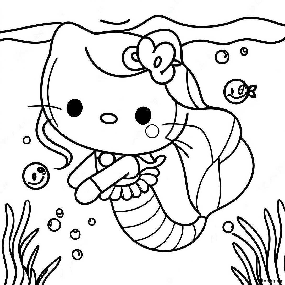 모험적인 헬로키티 인어 수중 색칠 공부의 인쇄 가능한 PDF 다운로드