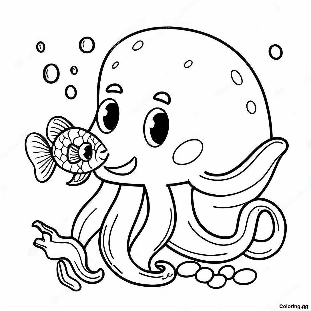 물고기와 친구가 되는 친근한 10대 크라켄 색칠 공부 페이지의 인쇄 가능한 PDF 다운로드
