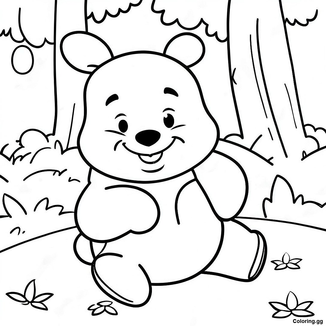 숲속에서 노는 아기 곰돌이 푸 색칠 공부 페이지의 인쇄 가능한 PDF 다운로드