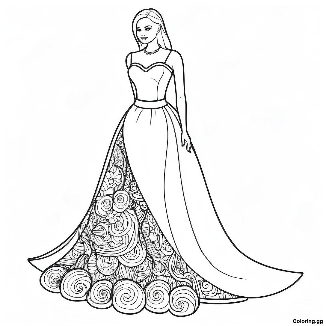 우아한 바비 드레스 색칠 공부 페이지의 인쇄 가능한 PDF 다운로드